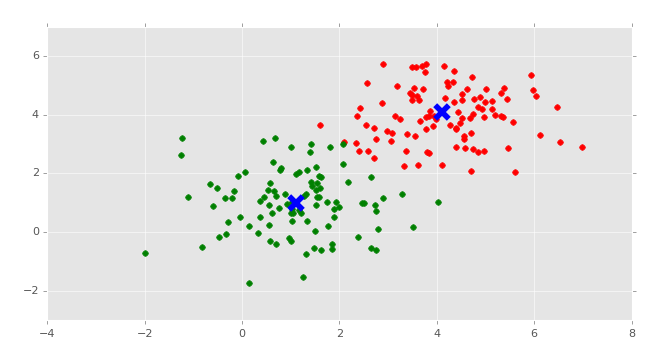 Do you see the Voronoi cells? I hope not, we didn't draw them. Remember, those are the polygons that mark the divisions between clusters. Here, we have each plot marked, by color, what group it belongs to. We have also marked the centroids as big blue "x" shapes.